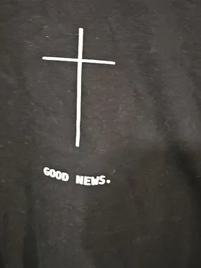 Black Gildan crewneck with a centered white cross graphic. Small white "GOOD NEWS." text below the cross. Simple, minimal design for everyday wear. Easy to style with casual looks.