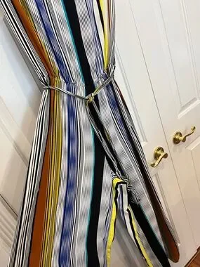 Bold vertical stripes in multicolor pattern. Features a self-tie belt for a cinched waist. Lightweight flow and easy movement. Stylish for casual or dressy occasions.