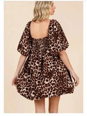 A flattering mini dress in a bold brown leopard print. Features puff sleeves and a square neckline for a stylish silhouette. Lightweight and flowy for easy all-day wear. Perfect for day-to-night looks.