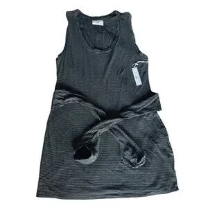 Sol Angeles Stripe Wrap Dress. Dress is black with white striped. It's sleeveless with a scoop neck and tie front waist. Dress is made of a cotton poly blend and is a woman's size medium. Dress is brand new with tags. Org. list price $128. Made in the USA.