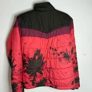 Bold red and brown design. Perfect for skiing. Features floral accents. Durable and warm.