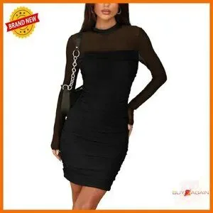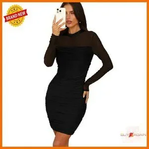 Brand new, never worn, and in flawless condition — this chic and sexy mini dress combines a bodycon silhouette with sheer mesh long sleeves and ruched details for a head-turning look perfect for nights out and special occasions. The stretchy, form-fitting fabric is lightweight and comfortable for all-day wear.