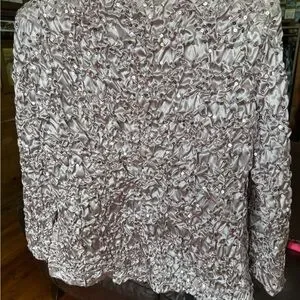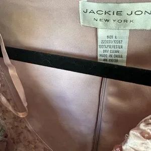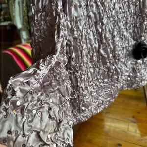 Elegant Jackie Jon jacket with sequin embellishments. Soft lavender color. Features a stylish black flower accent.