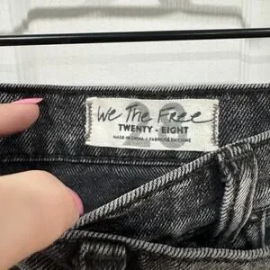 This is a stylish We The Free black denim mini wrap skirt in size 28. The skirt features a frayed asymmetrical design with a button closure and a mid-rise waist, perfect for parties or casual occasions in the summer or spring. Made of a cotton blend fabric with a dark wash, this skirt is designed with a rock theme in mind and adds a touch of edgy flair to any outfit. Ideal for women looking for a versatile and trendy addition to their wardrobe.