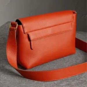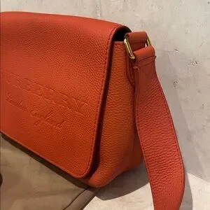 Smooth orange leather with embossed Burberry logo. Adjustable shoulder strap with gold hardware. Sleek flap closure and structured silhouette. Modern, versatile style for everyday wear.