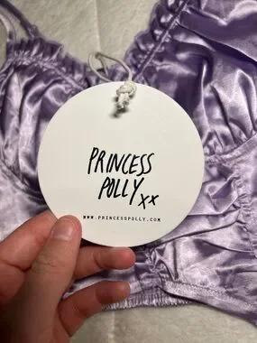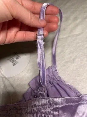 Lavender satin bustier crop top with ruched front and ruffle trim. Thin adjustable straps and structured cups create shape. Smooth satin sheen for a feminine look. Cropped silhouette pairs well with high-waist bottoms.