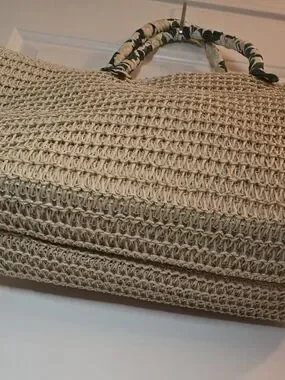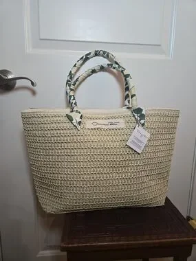 Cream woven tote with green-and-cream floral-trim handles. Lightweight and versatile for daily use. Structured interior keeps essentials organized. Floral handle detail adds a fresh, feminine accent.
