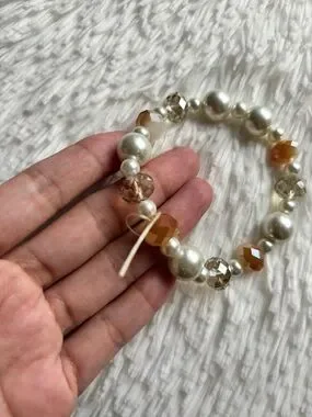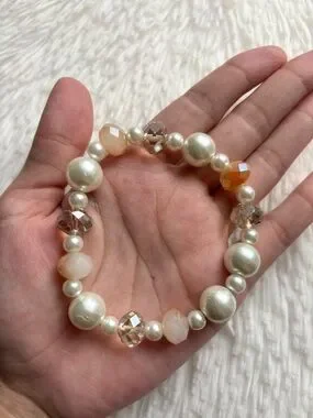 Elegant stretch bracelet featuring white faux pearls and amber-toned faceted beads. Lightweight and comfortable for everyday wear. Neutral white and warm amber blend easily with many outfits. Secure stretch design for easy on and off.
