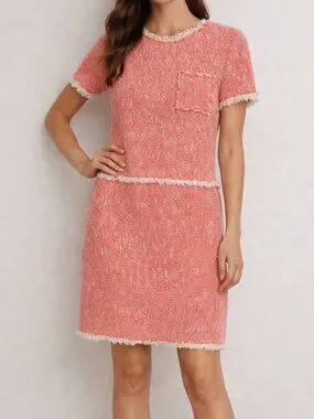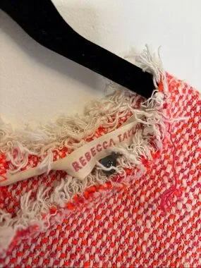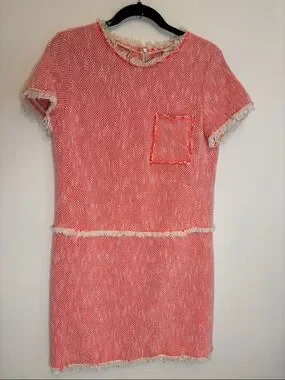 Chic and feminine Rebecca Taylor shift dress in a beautiful coral and cream tweed. This classic silhouette features textured fabric with frayed trim details for that signature polished yet effortless look. Perfect for spring events, parties, or a Kentucky Derby outfit.
