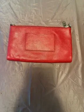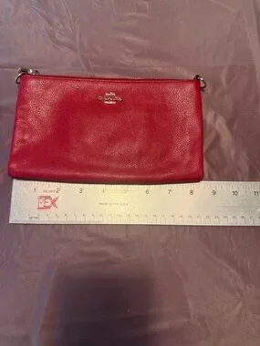 Compact red leather clutch by Coach. Features a top zip closure and gold-tone logo. Slim design ideal for essentials.