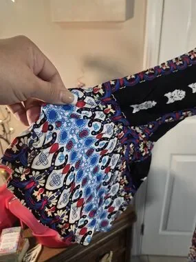 Effortless boho maxi dress with long sleeves and a flattering V-neck. Its a wrap around dress so almost any size could fit! Features a black base with blue and multicolor printed panels for a chic, patterned look. Lightweight and flowy for all-day comfort and easy styling.