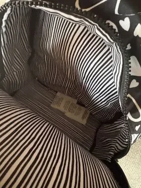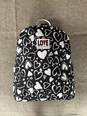 Stylish Brighton backpack with bold black and white heart pattern. Front LOVE Brighton logo patch. Top zip closure and two side slide pockets. See photos for dimensions.