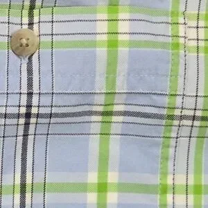 Wrangler George Strait Cowboy Cut short sleeve button up shirt in a blue green plaid pattern. Features a single chest pocket and button-down collar. This classic Western-style shirt is perfect for casual wear, rodeos, or country music concerts.