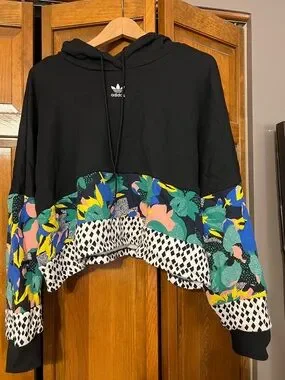 adidas cropped Black Hoodie with Multicolor Floral & Geometric Panels