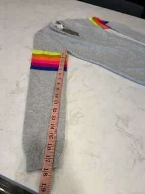 Light gray cashmere V-neck sweater. Long sleeves with bold rainbow bands. Soft, fine-knit fabric for easy layering. Playful color stripes brighten a classic look.