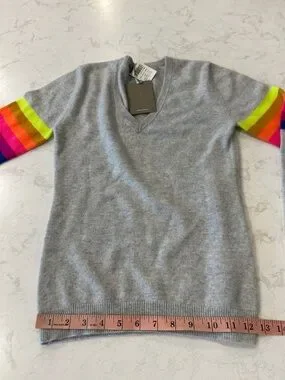 Brodie 100% Fine Cashmere Light Gray V-Neck Sweater Preppy Rainbow Sleeve Bands