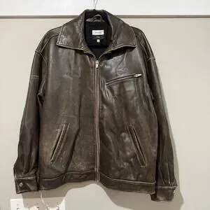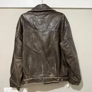 Reformation Veda Marco Leather Oversized Bomber in Pit Stop Brown. Women's Size XS / Extra Small. Features collared neck, full front zip closure, front pockets, chest zip pocket, long sleeves, soft flexible leather, lined, snap button cuffs, oversized slouchy fit, intentional one of a kind distressing. 100% leather. Brand new with tags. Brand tag semi detached. Retail $658.