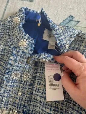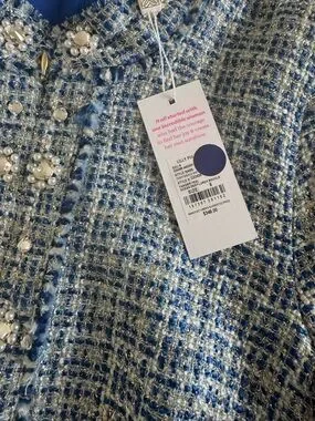 Lilly Pulitzer tweed piece in blue and white. Features pearl and crystal embellishments. Fringed trim along collar and edges. Structured, polished silhouette with decorative buttons. Really nice and beautiful! New with tags