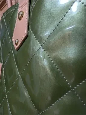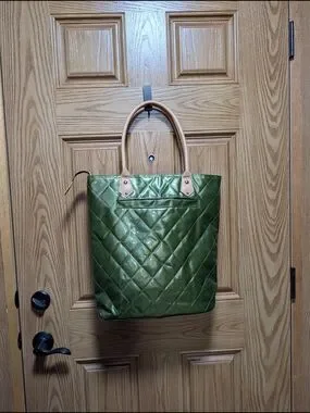 Chic quilted tote in glossy green. Contrasting tan handles and trim offer a classic look. Open-top design for easy access. Subtle branded plaque on front adds polish. feels like a soft plastic or vinyl.