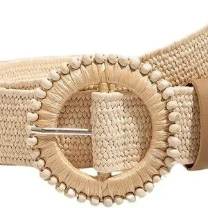 Features: Wide woven straw style belt with high stretch for a comfy fit. Round buckle adds a classic cowgirl vibe. Versatile accessory that works with casual dresses, long shirts, coats, or even evening wear.