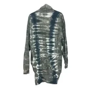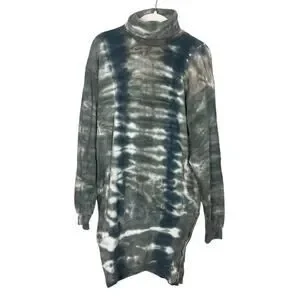 Stylish tie-dye turtleneck sweater dress. Features a blend of gray and blue tones.