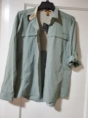 Light sage green performance button-up from Eddie Bauer. Moisture-wicking fabric with sun protection. Lightweight, breathable mesh backing. Button-front and classic collar. Ideal for outdoor activities.