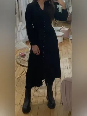 Sleek black midi dress with full button-front. Long sleeves and subtle collar detail. Soft drape with a tailored waist. Simple, versatile silhouette for many occasions.
