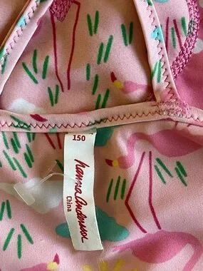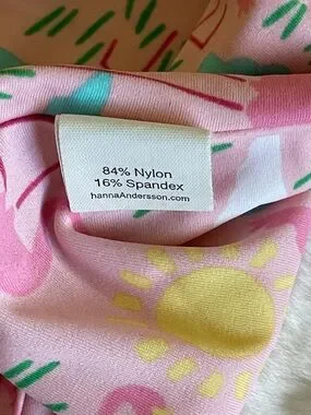 Cute pink one-piece swimsuit. White polka dots all over. Heart applique on chest with coordinating trim. REVERSIBLE with Flamingos on the other side. Thin adjustable straps. Fun and playful design for pool days. Hanna Andersson brand, Size 150 or a 12 Excellent Condition. Not sure this was ever worn!