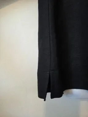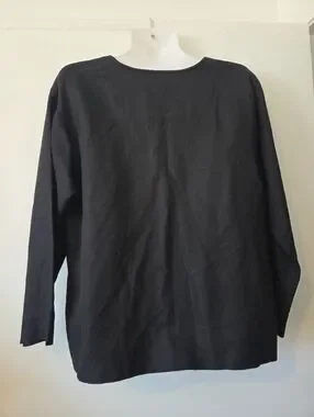 Cropped black linen blend collarless button down top by Studio by Liz Claiborne. Oversize fit. Shell buttons down the front and an extra one is provided as well. 3/4 length sleeves . Side slits. Wear it as a jacket over an outfit or as a blouse. I love pairing it with palazzo pants for a relaxed chic look as per the first photo. PTP 21". The size tag indicates small but this will fit up to a small medium. EUC.