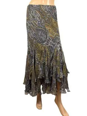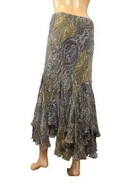 Stunning ECI New York asymmetrical skirt crafted from 100% silk, featuring a beautiful paisley pattern in earthy fairycore tones with flowing ruffle details.