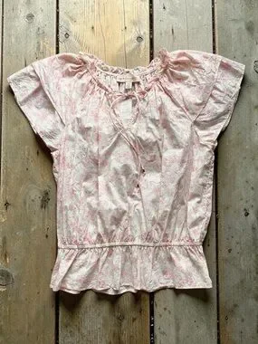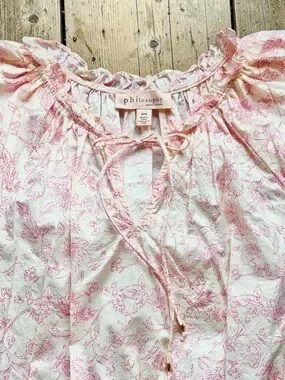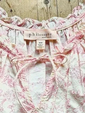 Soft, feminine, and effortlessly pretty—this Philosophy floral blouse features a delicate pink toile-style print on a creamy background. The ruffled neckline with tie detail and subtle peplum waist give it that romantic, cottagecore feel that’s easy to dress up or down.