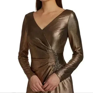 NWT Marchesa Notte Metallic V-Neck Foiled Lamé Side Pleats Dress. A 70s-inspired draped design with a stunning metallic finish.