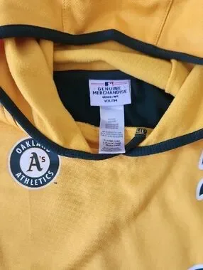 Official Genuine Merchandise hooded sweatshirt. Team patch and A's logo on chest. Cozy fleece-lined hood. Contrasting dark green trim and accents.