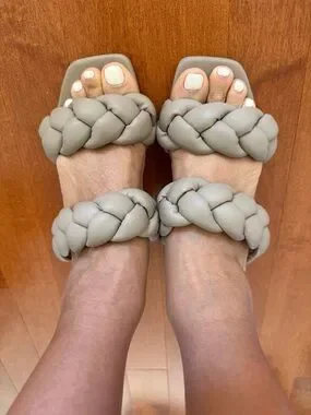 Padded braided double straps for a soft, textured look. Slip-on design for easy wear. Square toe with a clean, modern shape. Subtle neutral hue for versatile styling.
