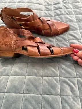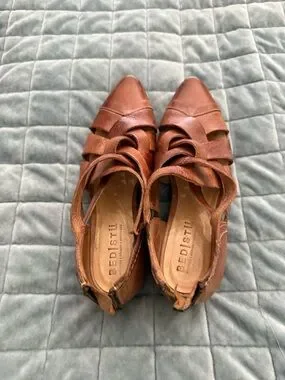 Handcrafted woven leather upper with pointed toe. Crisscross straps add visual interest. Soft leather for comfortable wear. Versatile for casual or dress looks.