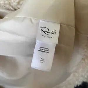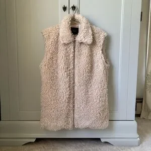 Ivory faux-shearling vest by Rails. Zip-front closure for easy wear. High collar for added warmth. Plush textured finish for cozy layering. Pairs well with knits and trousers.