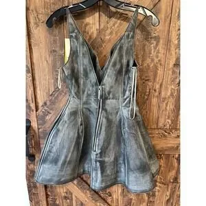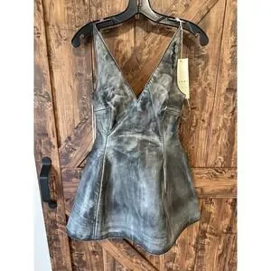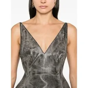 Details: Fitted waistline, flared skirt, thigh-length, calf leather, crinkled finish, washed effect, plunging v-neck, full lining, short rear zip fastening.