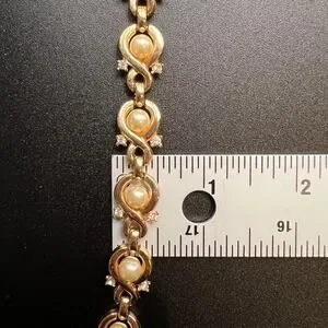 Vintage Faux Pearl Rhinestone Necklace Gold Tone Infinity Link Choker Elegant