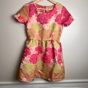 This is a vibrant floral patterned dress by KOKO, featuring a mix of pink, green, and orange hues. It has short sleeves and a fitted waist, ideal for spring or summer occasions. Excellent condition. Measures 13.5” at waist; 17” ptp; 30” length