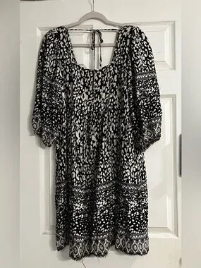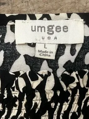 Umgee USA Smocked Boho Animal Print Dress Black White Sz L Smocked Chest
