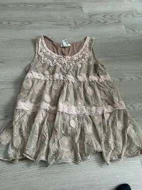 Sleeveless tiered tank with lace overlay. Scoop neckline with crochet trim. Delicate embroidered medallion accents. Soft, flowy silhouette in neutral tones.