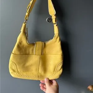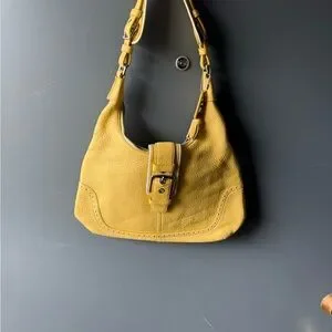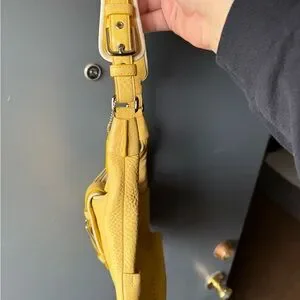 Stylish yellow leather shoulder bag with a buckle-front detail. Soft pebbled leather with a comfortable shoulder strap. Versatile design that complements casual and dressy looks. Durable hardware and secure closure for everyday use.