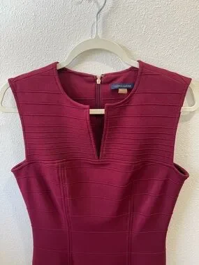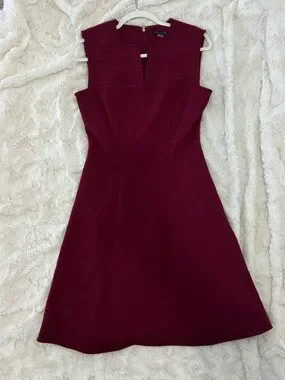 Fitted sleeveless bandage dress with subtle notch at the neckline. Flared midi skirt creates a polished silhouette. Back zipper closure for a clean finish. Versatile wine hue suitable for day or evening wear.