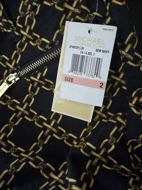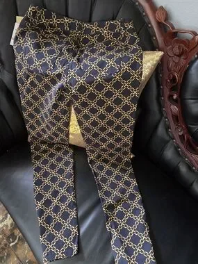 Michael Kors skinny pants in a navy blue base with an all-over gold chain print. Front zip pocket details and a button closure. Sleek, fashion-forward silhouette.