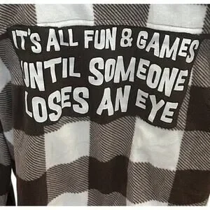 Relaxed boyfriend style comfy plaid fleece flannel cropped featuring It's All fun and Games Until Someone Loses An Eye graphic on the back upcycled from a flannel. Cowgirl, Camper, Grunge Gorpcore, funny, kid core retro vibes