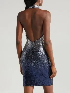 This eye-catching dress features a halter neckline with shimmering sequins that transition beautifully from silver tones at the top to deep blue/black throughout the body. The sparkle effect catches light from every angle — very elegant and flattering.