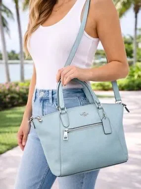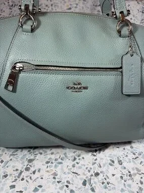 Authentic Coach Prairie Satchel (Style 56874) in soft pebbled leather. This structured, feminine silhouette features dual top handles and a removable crossbody strap for versatile wear. Finished in a beautiful light blue tone with silver-tone hardware—perfect everyday bag with a polished, classic Coach look.