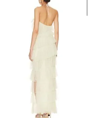 Delicate halter dress with layered tulle ruffles. Sheer, airy fabric for soft movement. Midi-length silhouette with asymmetric hem. Feminine and modern evening look.