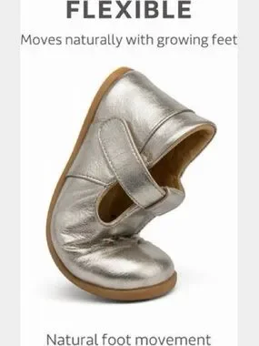 Comfortable silver Mary Jane shoe designed for babies and early walkers. Soft padded interior supports delicate feet. Secure hook-and-loop strap keeps shoe in place during movement. Flexible, durable sole for stable steps and traction. Elegant silver finish pairs easily with outfits.