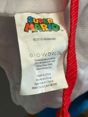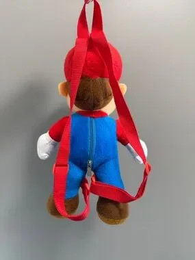 Iconic Super Mario in his classic red hat and blue overalls. Hidden zipper compartment on the back for small treasures (keys, wallet, or small toys) and adjustable red shoulder straps.